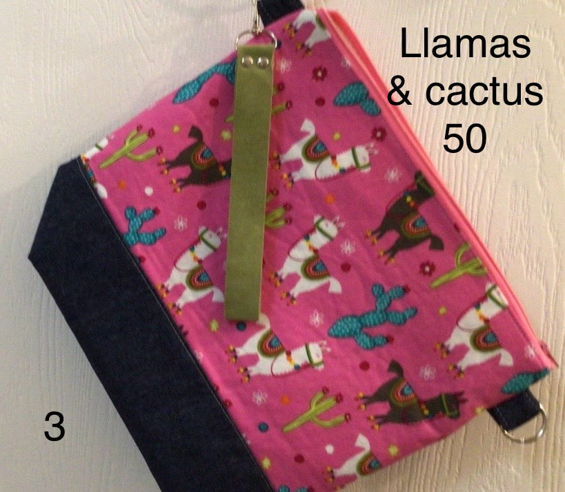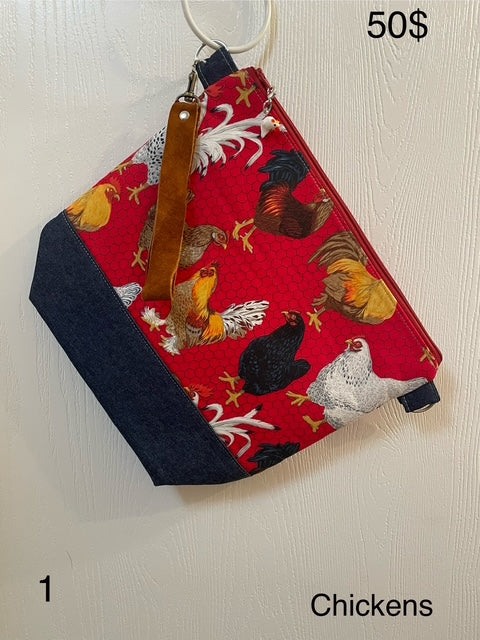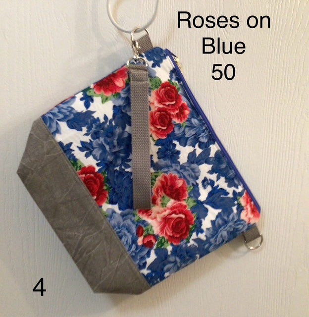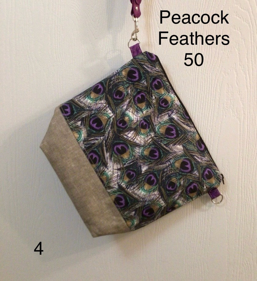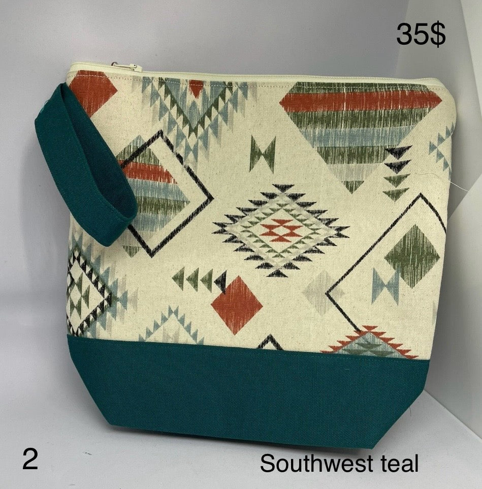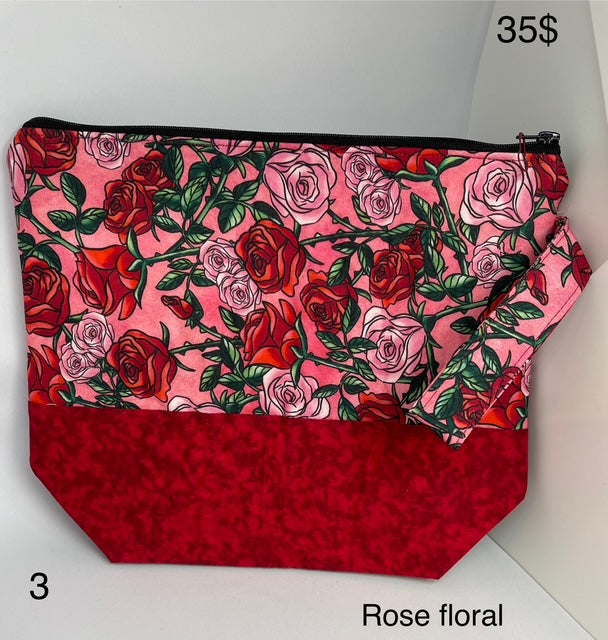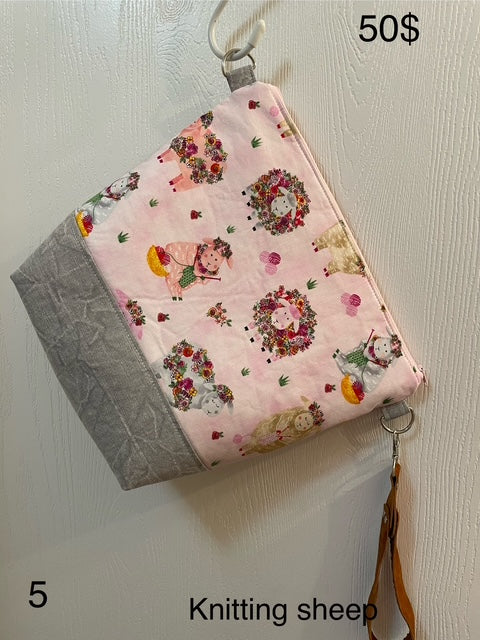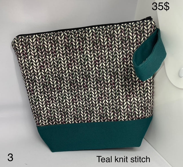 These bags have an inside pocket and a key ring. They are approximately 11" x 11" x 3". Just perfect for a 2 or 3 skeins project.