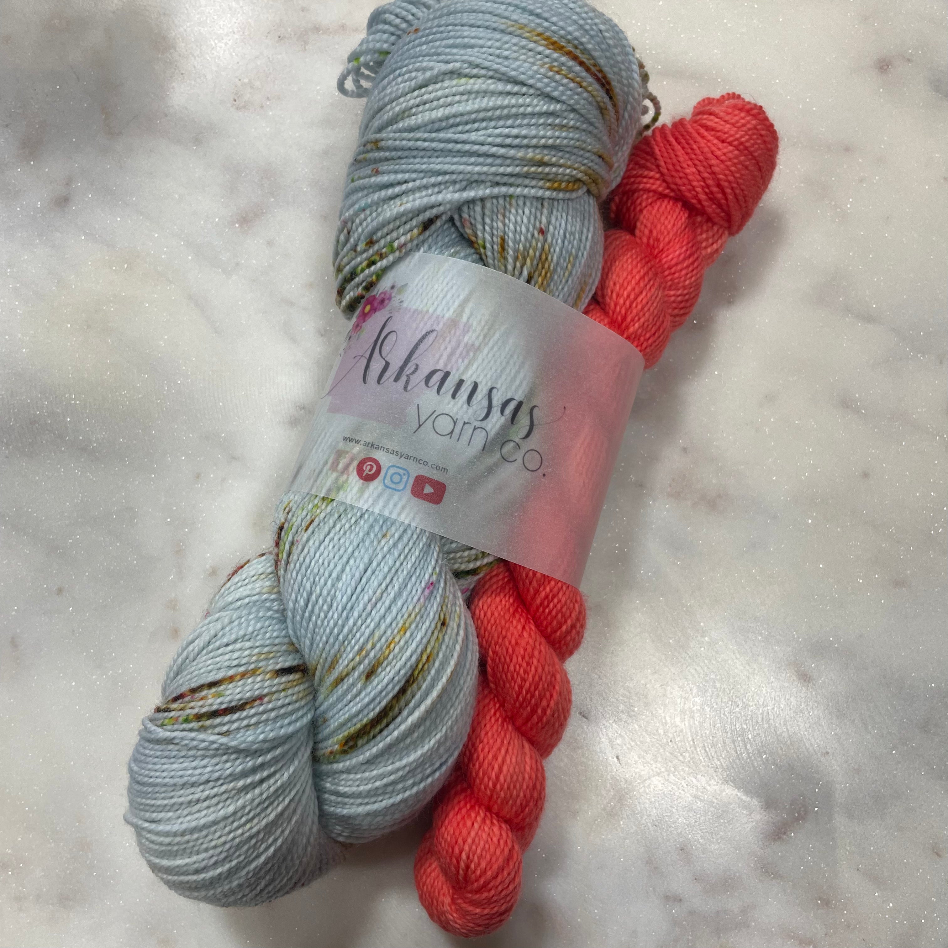 You need socks and we've got just the set for you! A full skein of beautiful soothing blue with browns, greens and corals for speckling. Paired with a twenty gram coral mini and you have the perfect summer vibe!
