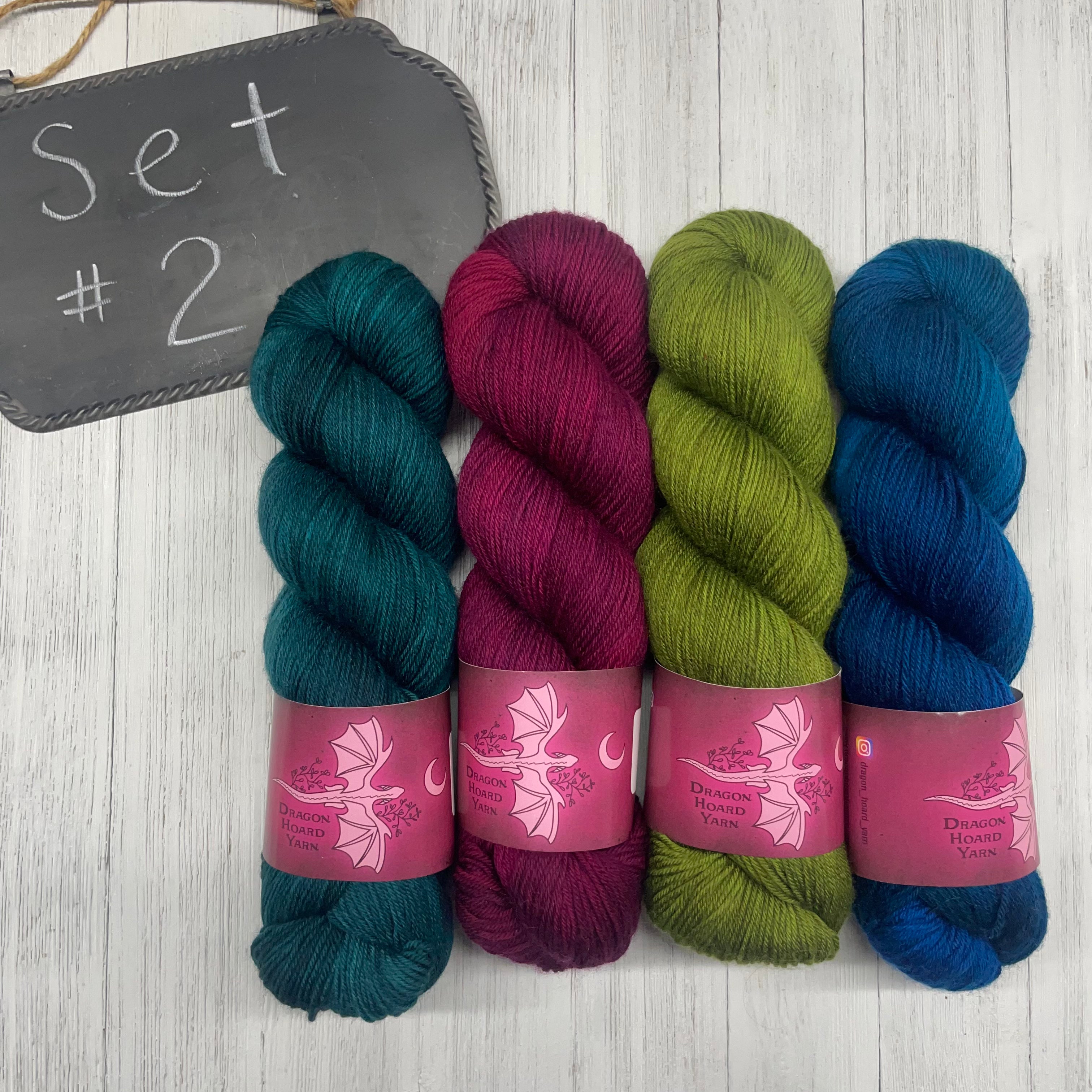2) Dragon Hoard - 85/15 SW Merino/Nylon - 436yds/100g; Fields of Asphodel, Forbidden Fruit, Venom, Cerberus
