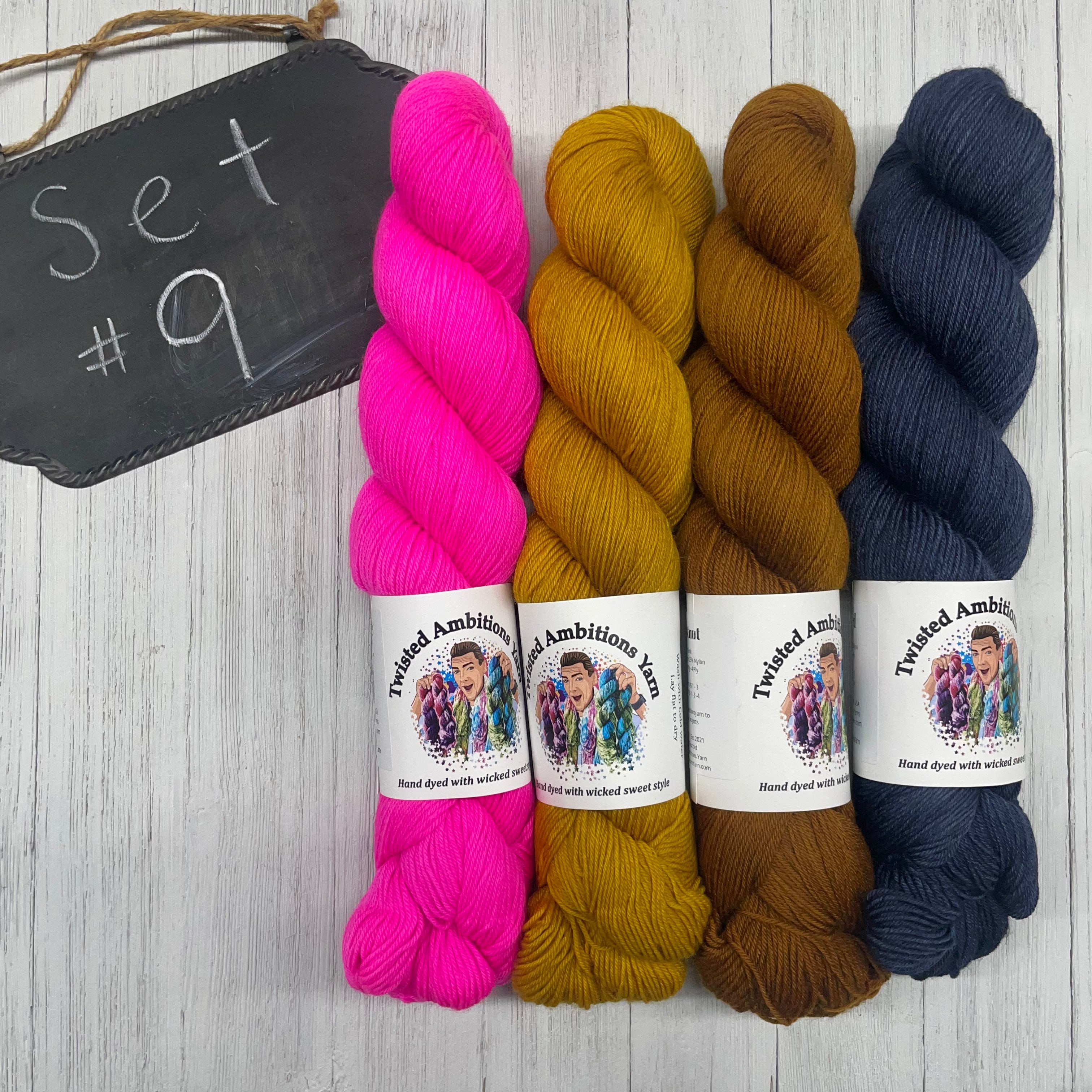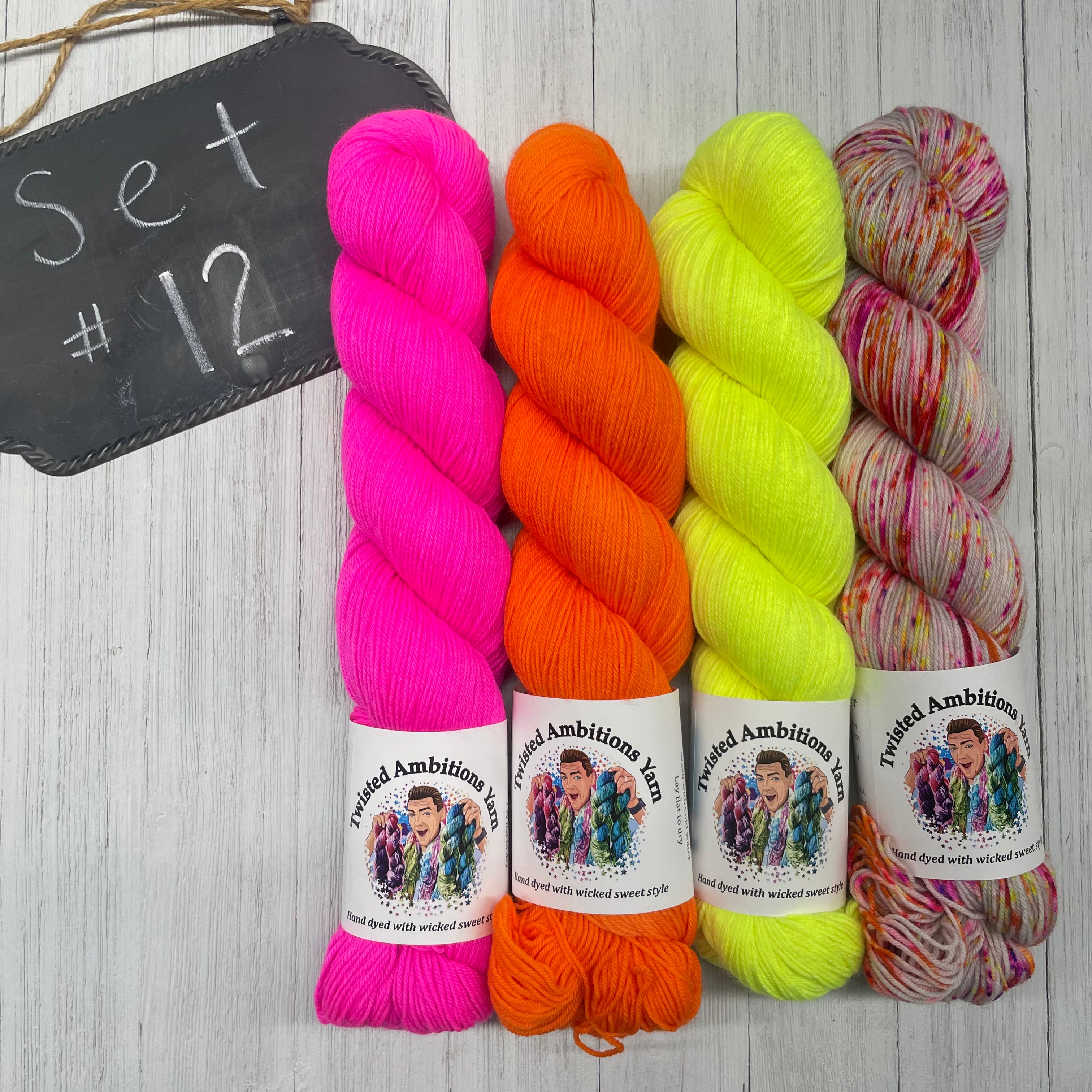 12) Twisted Ambitions - 75/25 SW Merino/Nylon - 463yds/100g; Hot Boy Summer, Highlighter, Crush, Brilliance