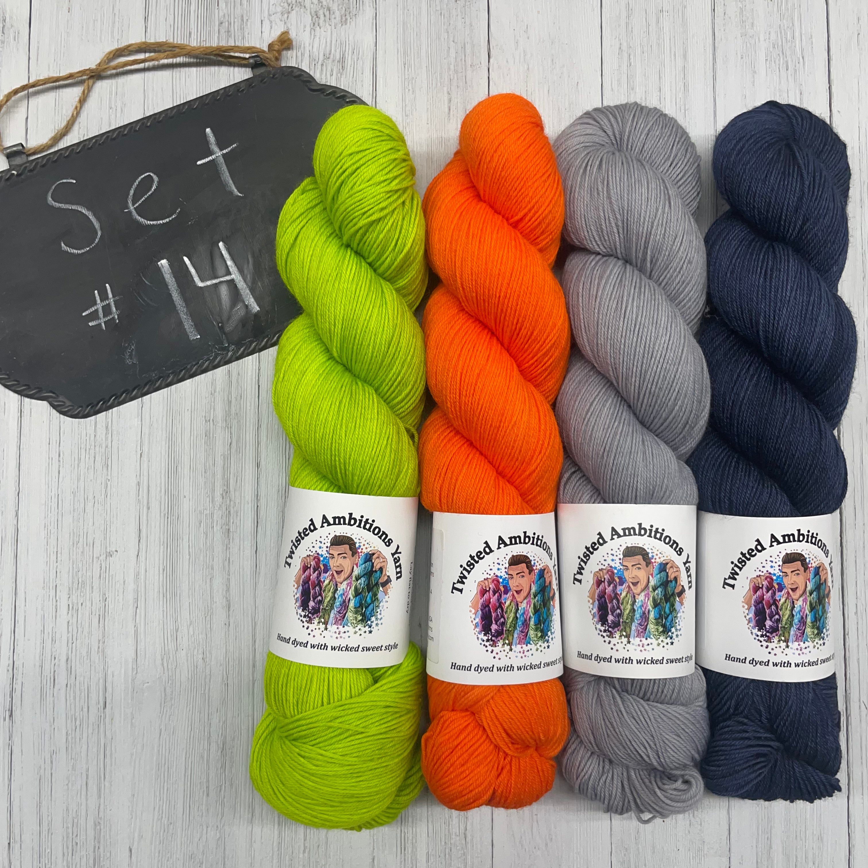 14) Twisted Ambitions - 75/25 SW Merino/Nylon - 463yds/100g; Limetreuse, Crush, Charred, Metal