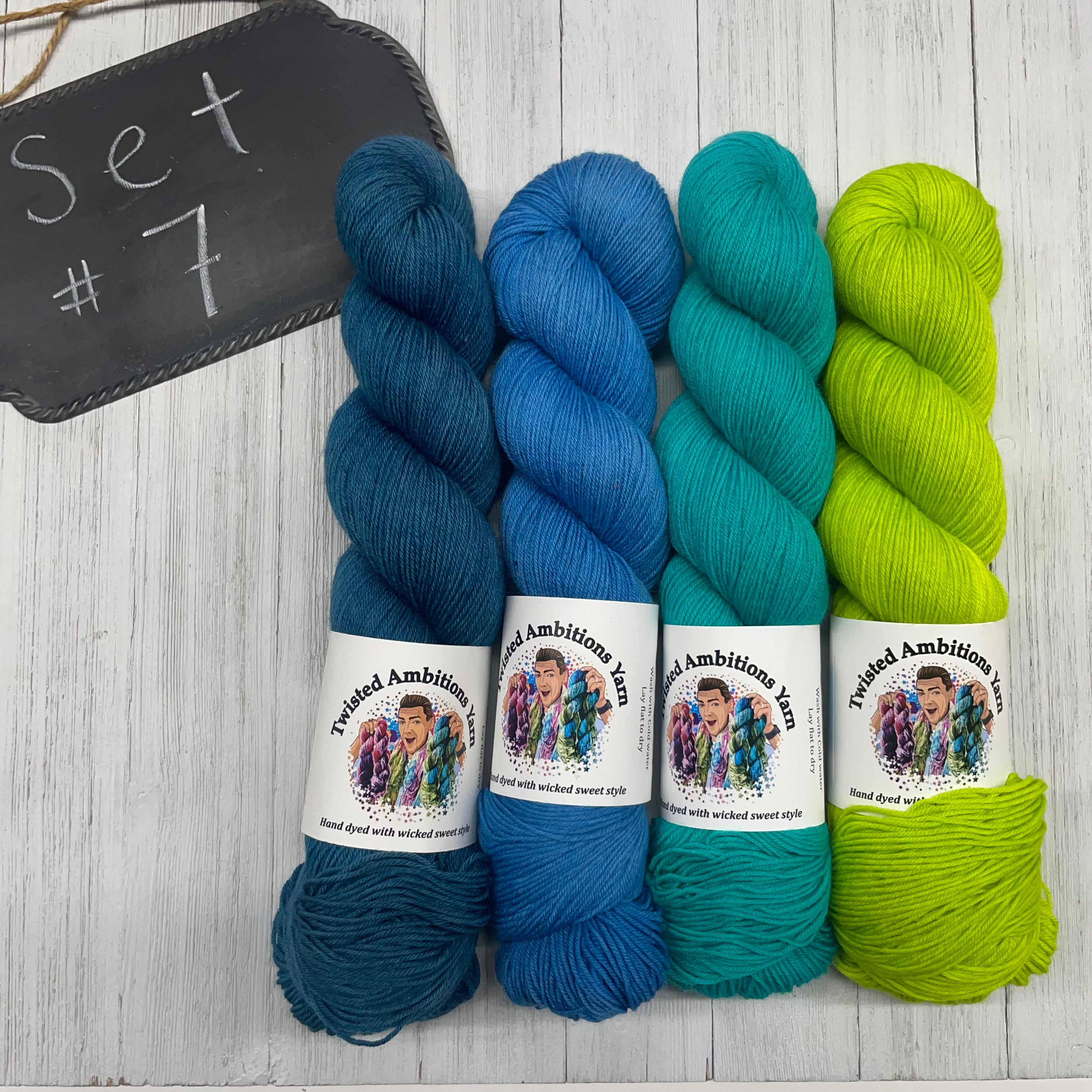7)Twisted Ambitions - 75/25 SW Merino/Nylon - 463yds/100g; Limetreuse, Ocean Breeze, Blue Steel, Blue Jean Baby