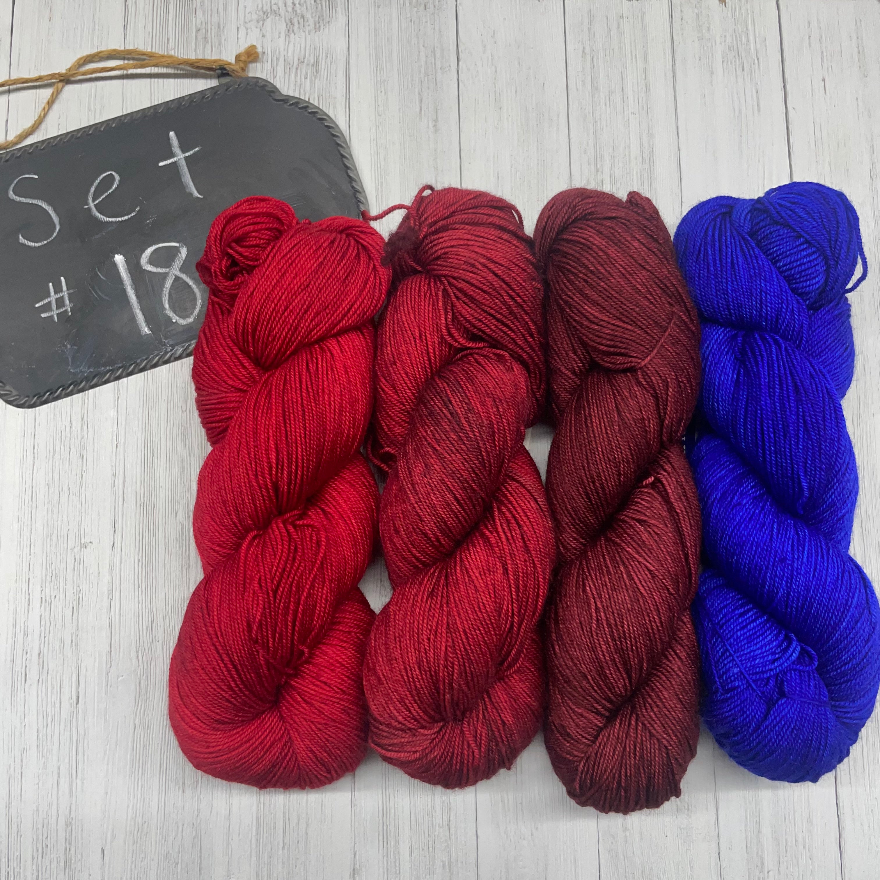 18) Malabrigo Sock - 100% SW Merino - 440yds/100g; Ravelry Red, Cereza, Tiziano Red, Matisse Blue