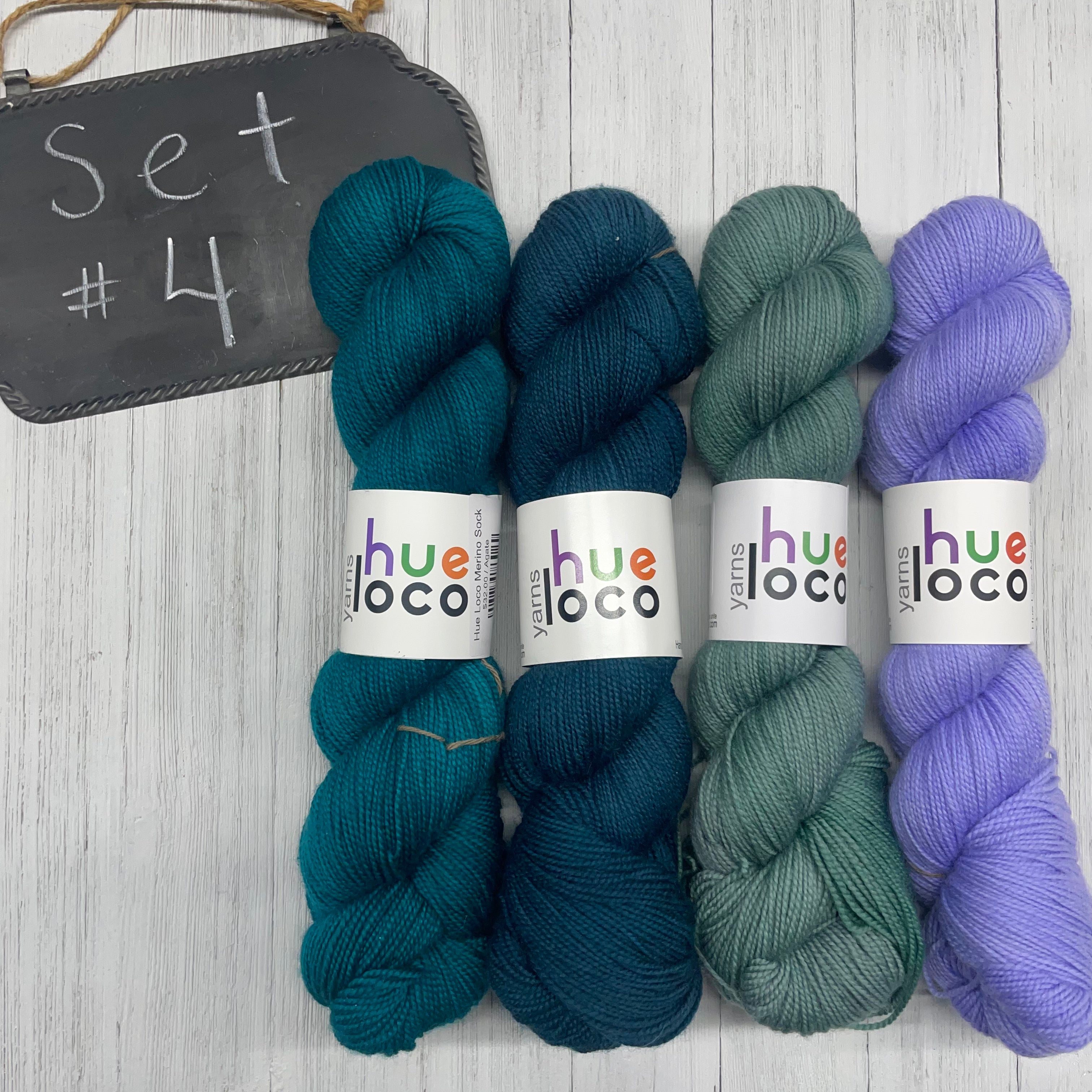 4) Hue Loco - 80/20 SW Merino/Nylon - 400yds/100g; Periwinkle, Sage, Spruce, Agate