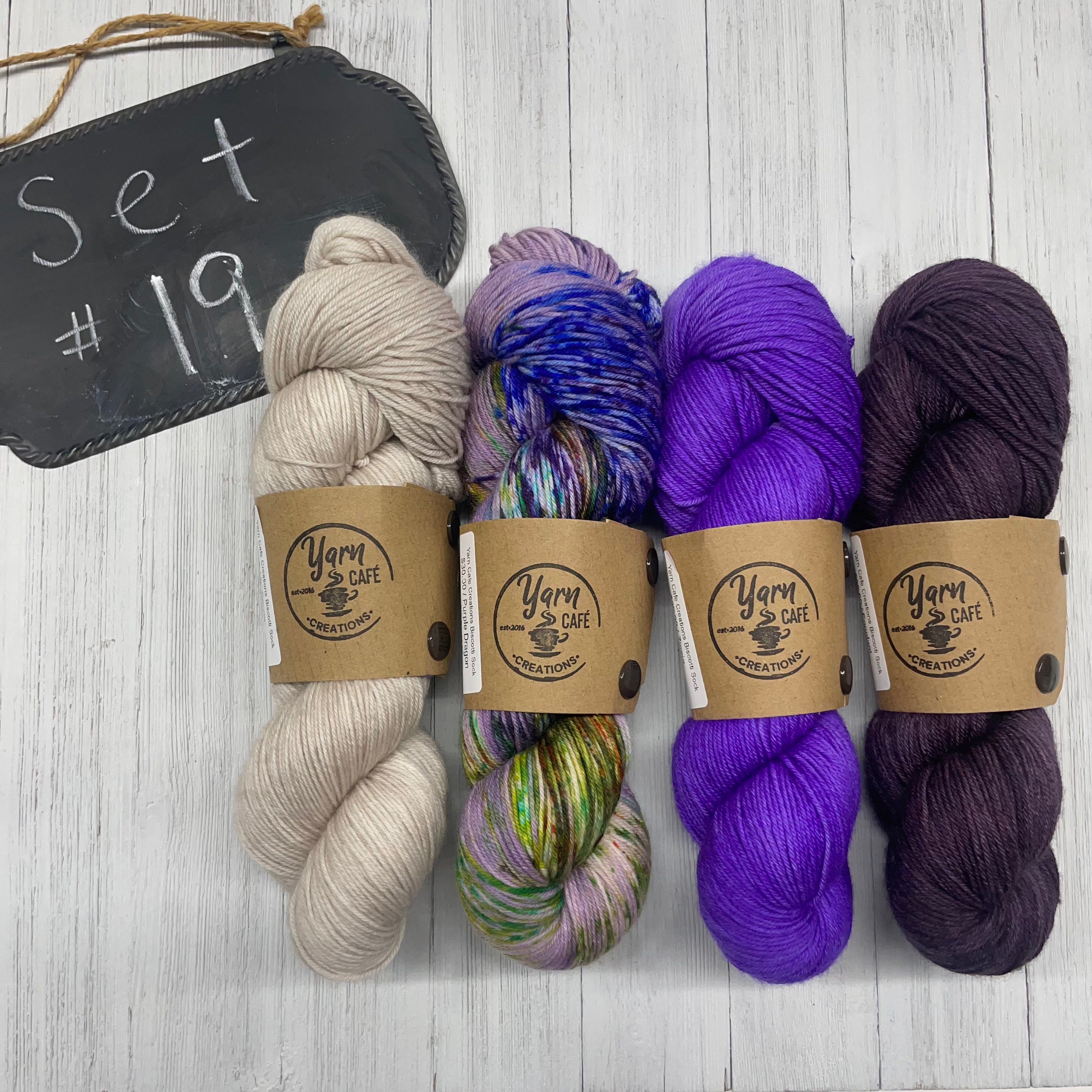 19) Yarn Cafe Creations - 85/15 SW Merino/Nylon - 436yds/100g; Zinnia, Eggplant, Cocoa, Purple Dragon Martini