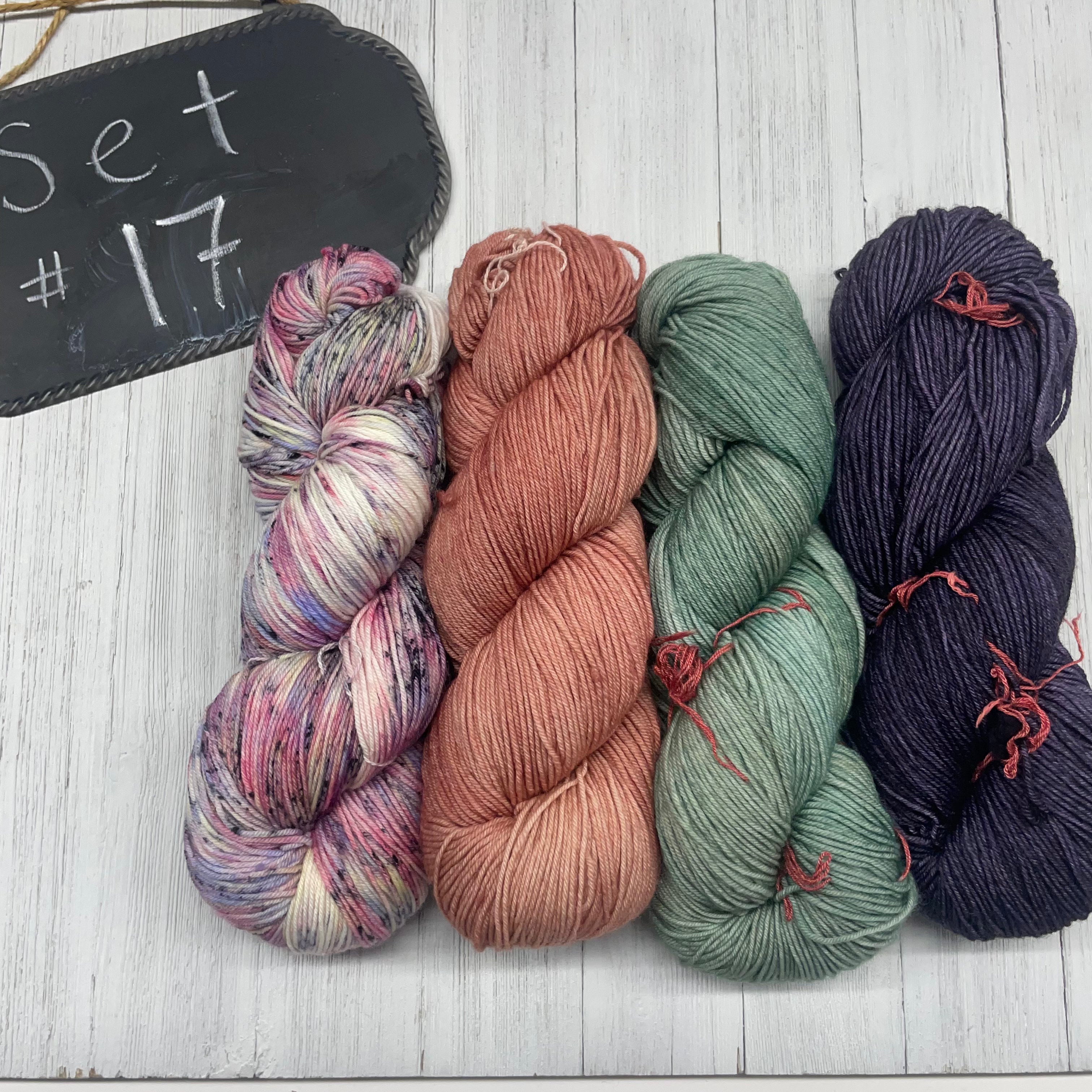 1) Jodi Long - 50/50 SW Merino/Silk - 232yds/50g; Imperial, Sugar, Blush, Petunia