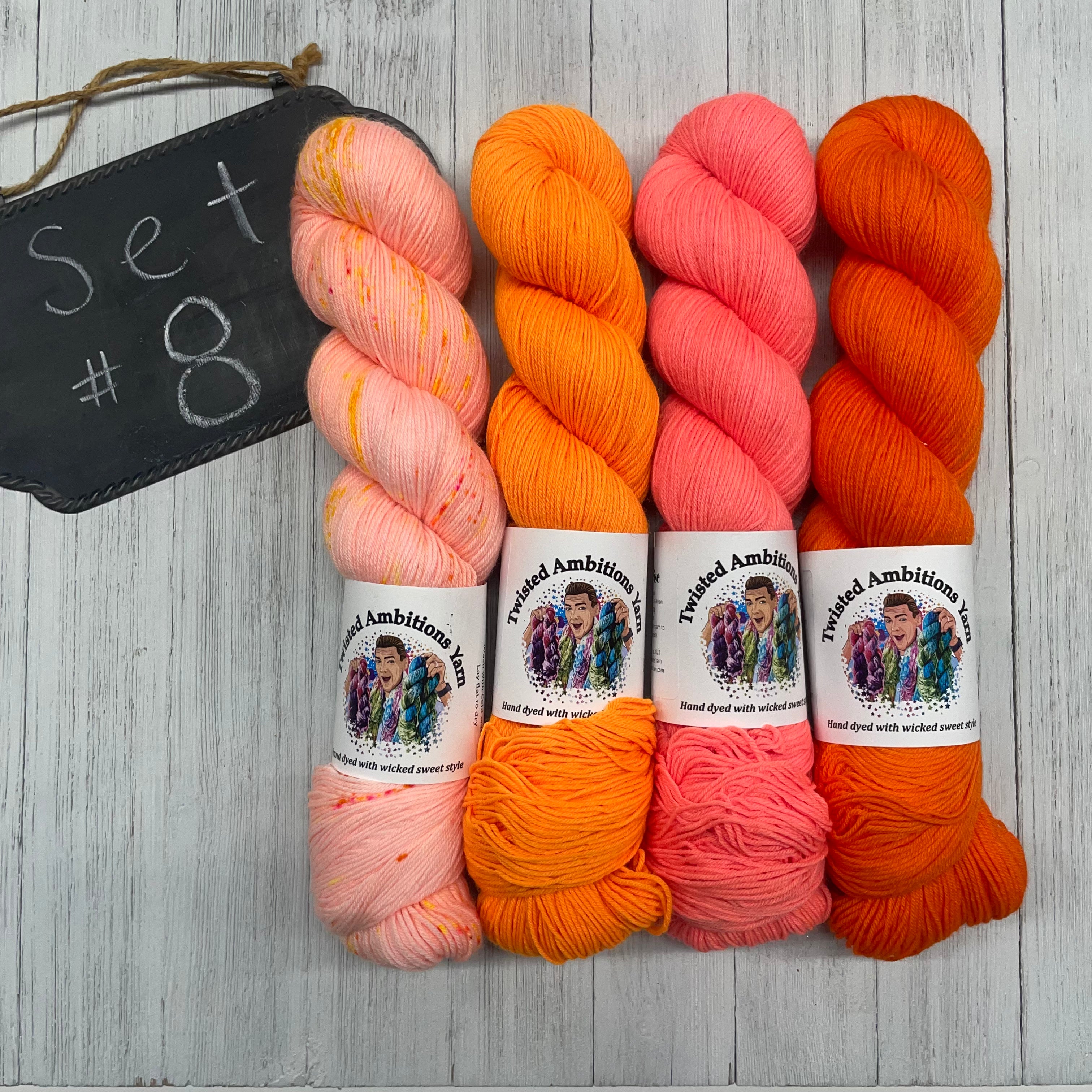 8) Twisted Ambitions - 75/25 SW Merino/Nylon - 463yds/100g; Sunshine, Crush, Sunrise, Fluorange