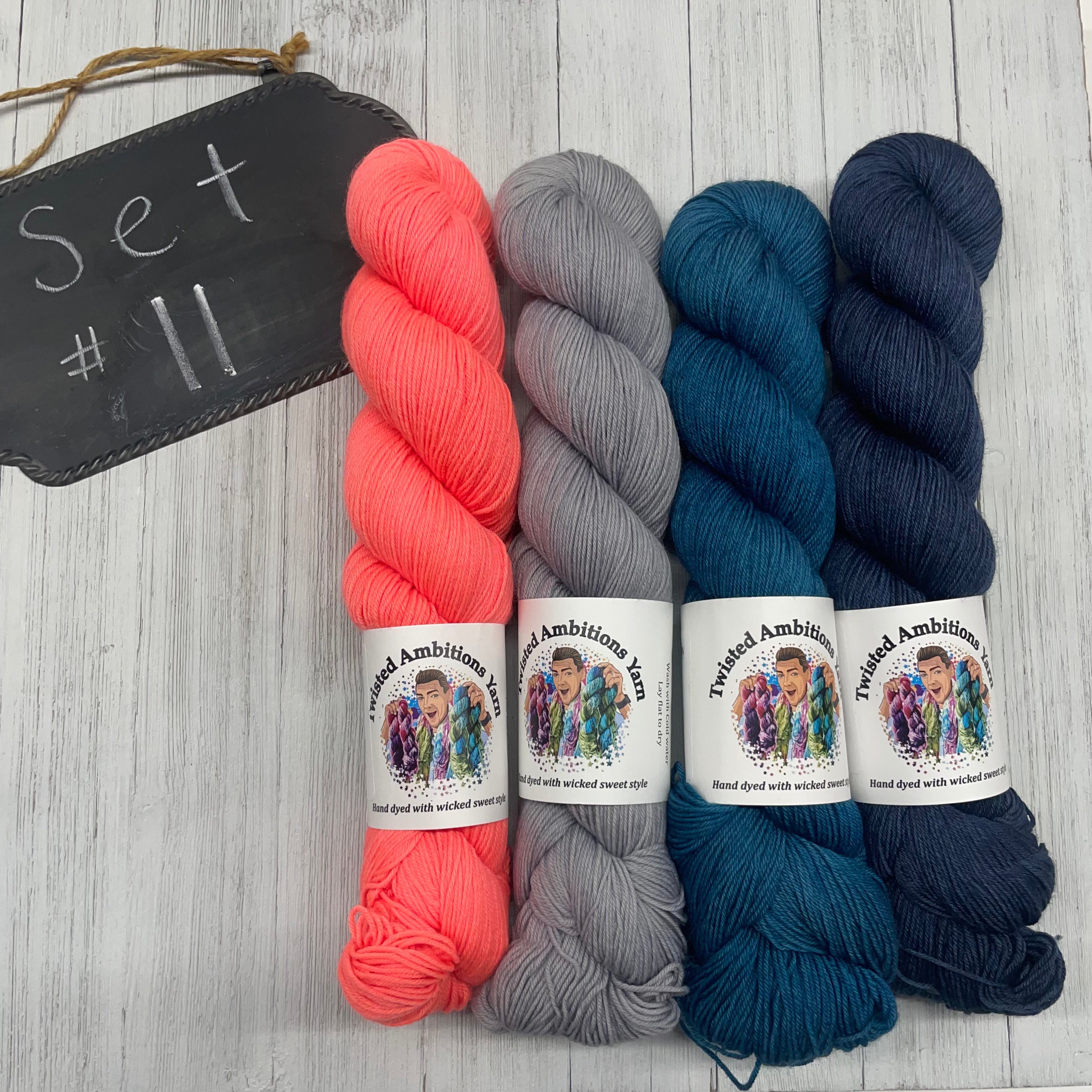11) Twisted Ambitions - 75/25 SW Merino/Nylon - 463yds/100g; Metal, Blue Jean Baby, Charred, Sunrise