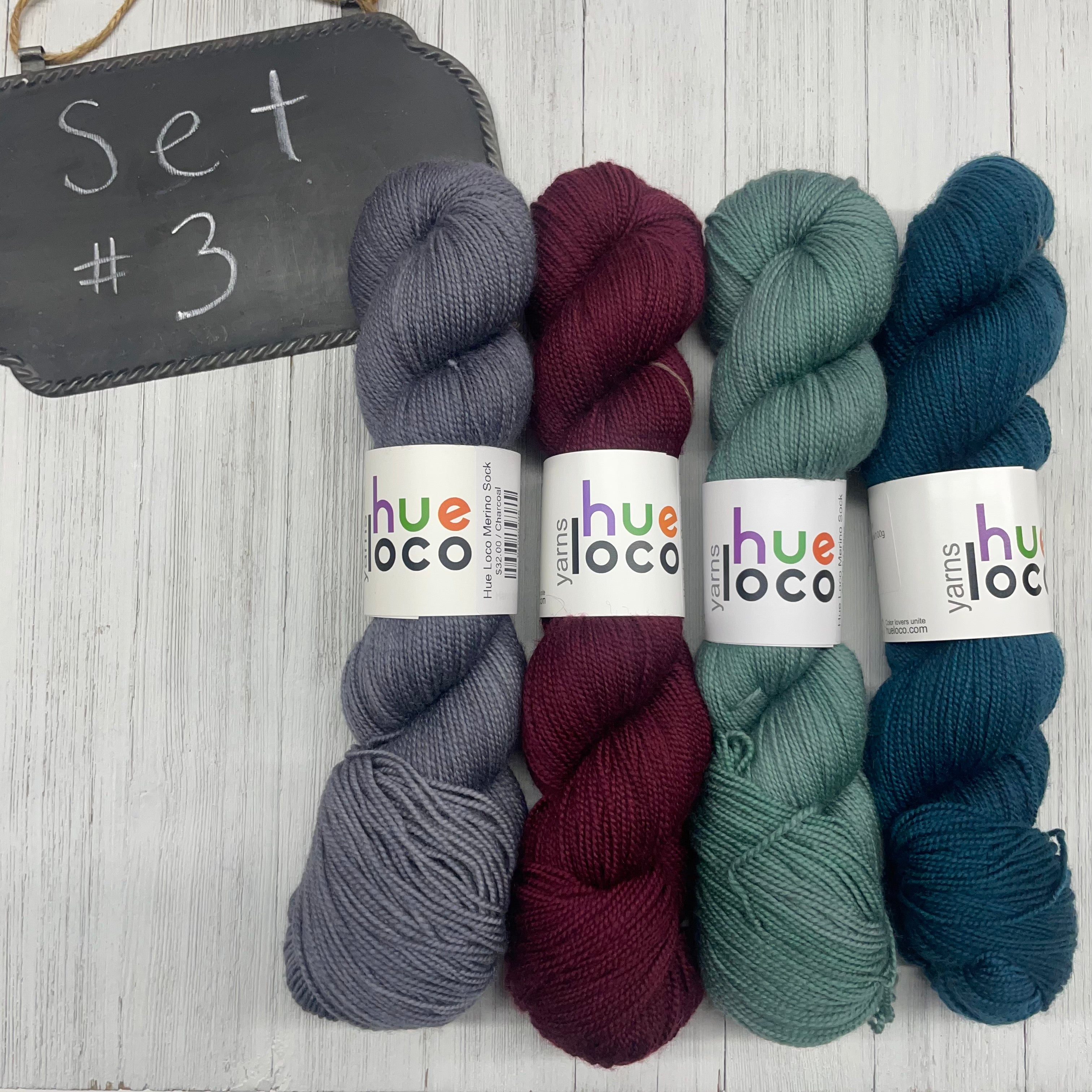 3) Hue Loco - 80/20 SW Merino/Nylon - 400yds/100g; Sage, Spruce, Sangria, Charcoal