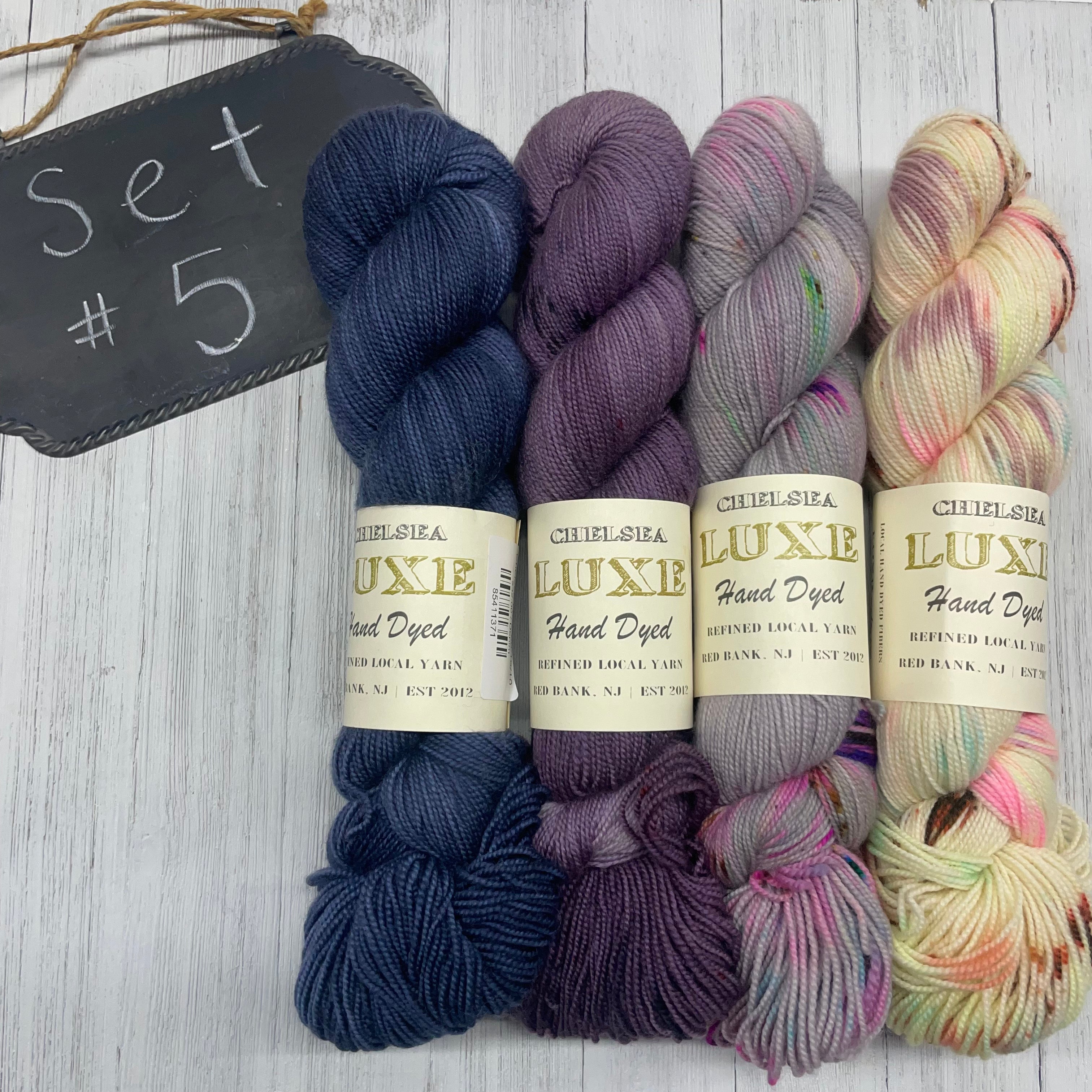 5) Chelsea Luxe - 80/10/10 SW Merino/Cashmere/Nylon - 400yds/100g; Denim, Viola, Gemstone, Spring Chicken
