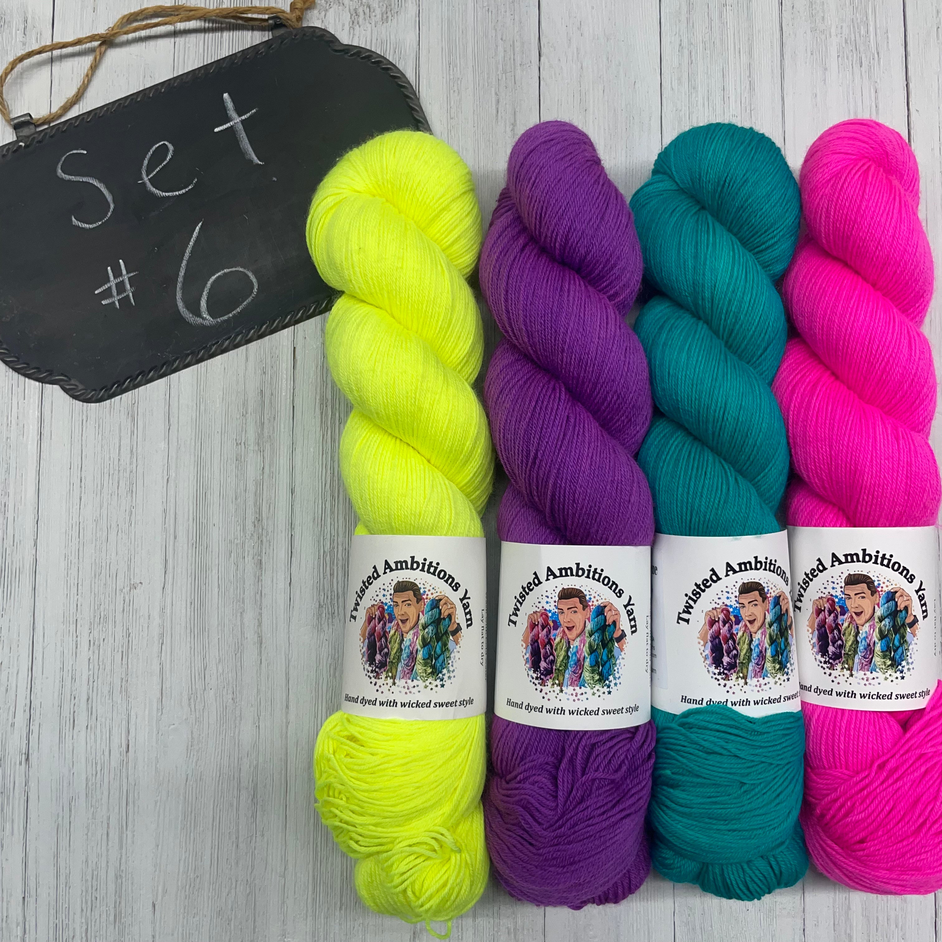 6) Twisted Ambitions - 75/25 SW Merino/Nylon - 463yds/100g; Brilliance, Ocean, Ghastly, Highlighter