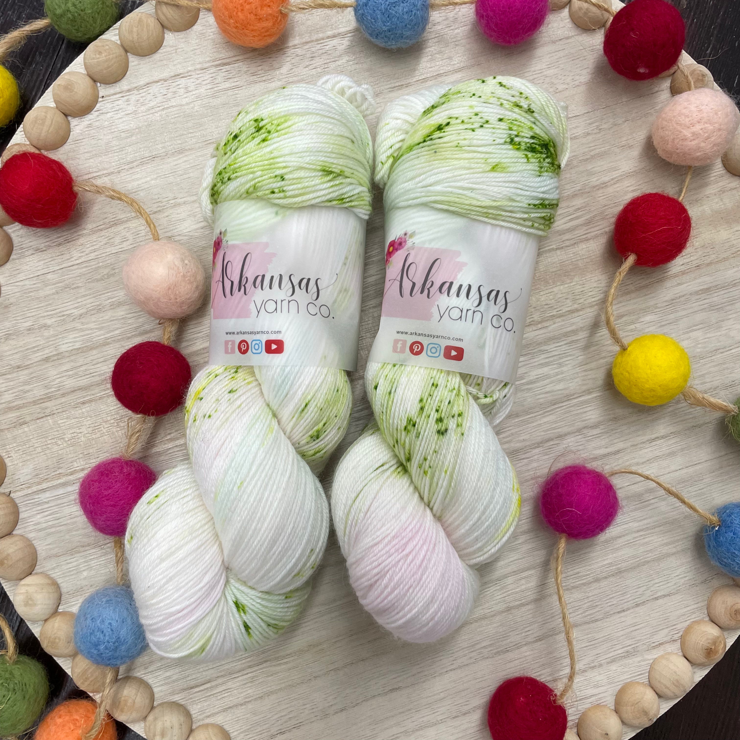 Enjoy this one of a kind colorway with green speckles and the palest of pink, like the first hints of Spring!