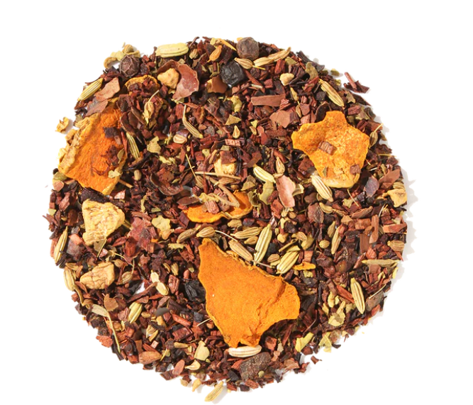 Golden Cacao - Honeybush Tea, Turmeric Pieces, Ginger Root, Cocoa Peel, Cocoa Nib, Black Peppercorns, Aniseed, Fennel, Blackberry Leaves, Vanilla Essence